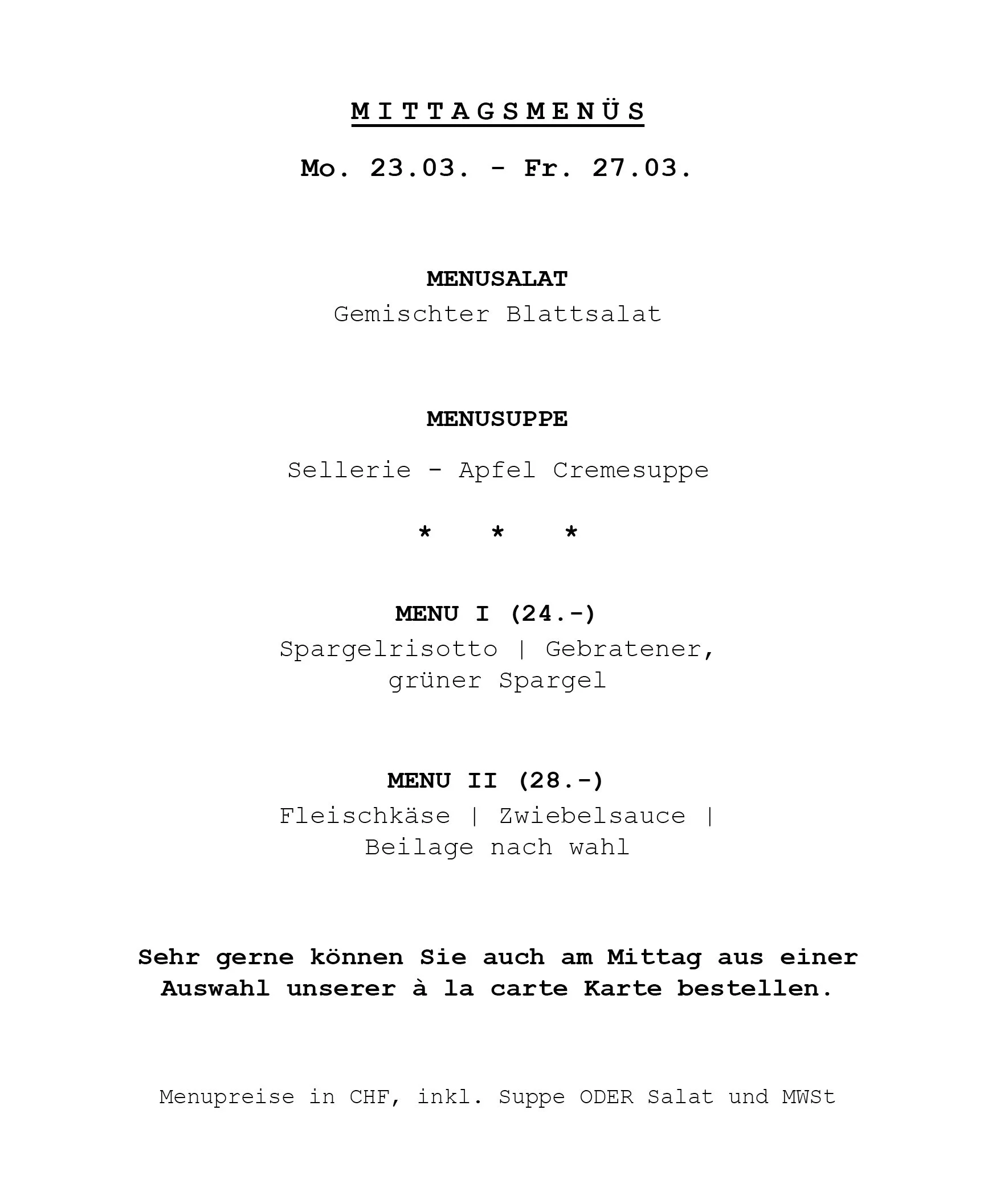 Entdecken Sie von Montag bis Freitag unsere täglich frisch zubereiteten Mittagsmenüs, sowie unsere à-la-carte-Auswahl.